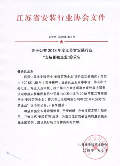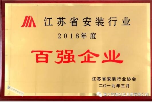 会上,南大四维凭借着较强的综合实力和优异的经营业绩,荣获2018年度江苏省安装行业“安装百强企业”称号。