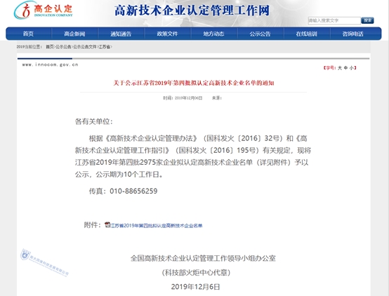 根据《高新技术企业认定管理办法》(国科发火〔2016〕32号)和《高新技术企业认定管理工作指引》(国科发火〔2016〕195号)有关规定,2019年12月6日,全国高新技术企业认定管理工作领导小组办公室发布了《关于公示江苏省2019年第四批拟认定高新技术企业名单的通知》,南京南大四维科技发展有限公司荣登榜单,顺利通过国家高新技术企业认定,由此正式迈入国家高新技术企业行列。