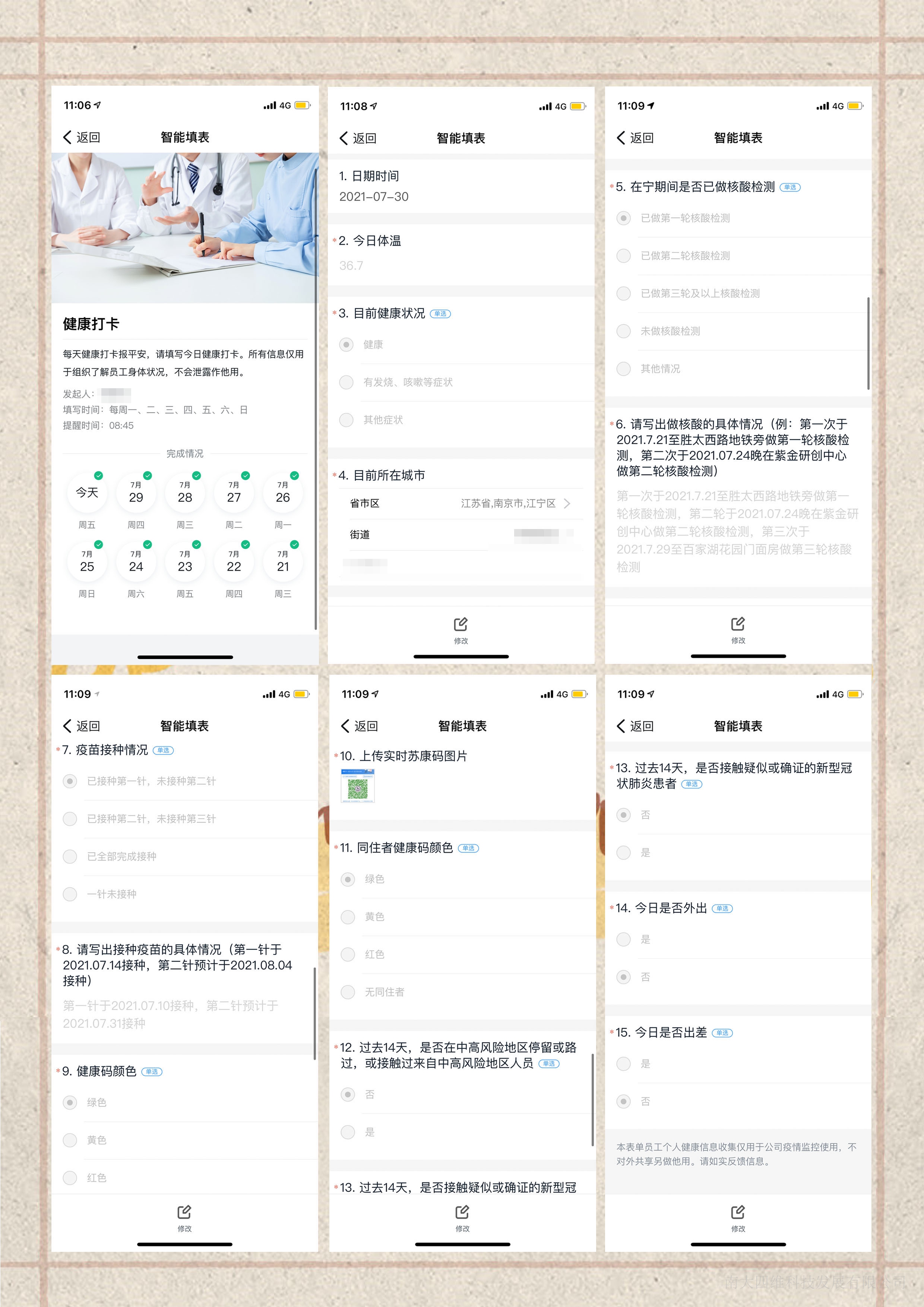 行管中心每日通过“钉钉APP”和“微信-总部及分公司网格员、防疫员交流群”发布健康打卡及网格员数据汇总表,对公司全体员工所在地区、健康情况、疫苗接种、核酸检测等信息进行详细跟踪及统计,并第一时间向全体员工通报。严格遵守“日报告、零报告”的原则,规范建立员工情况记录制度。