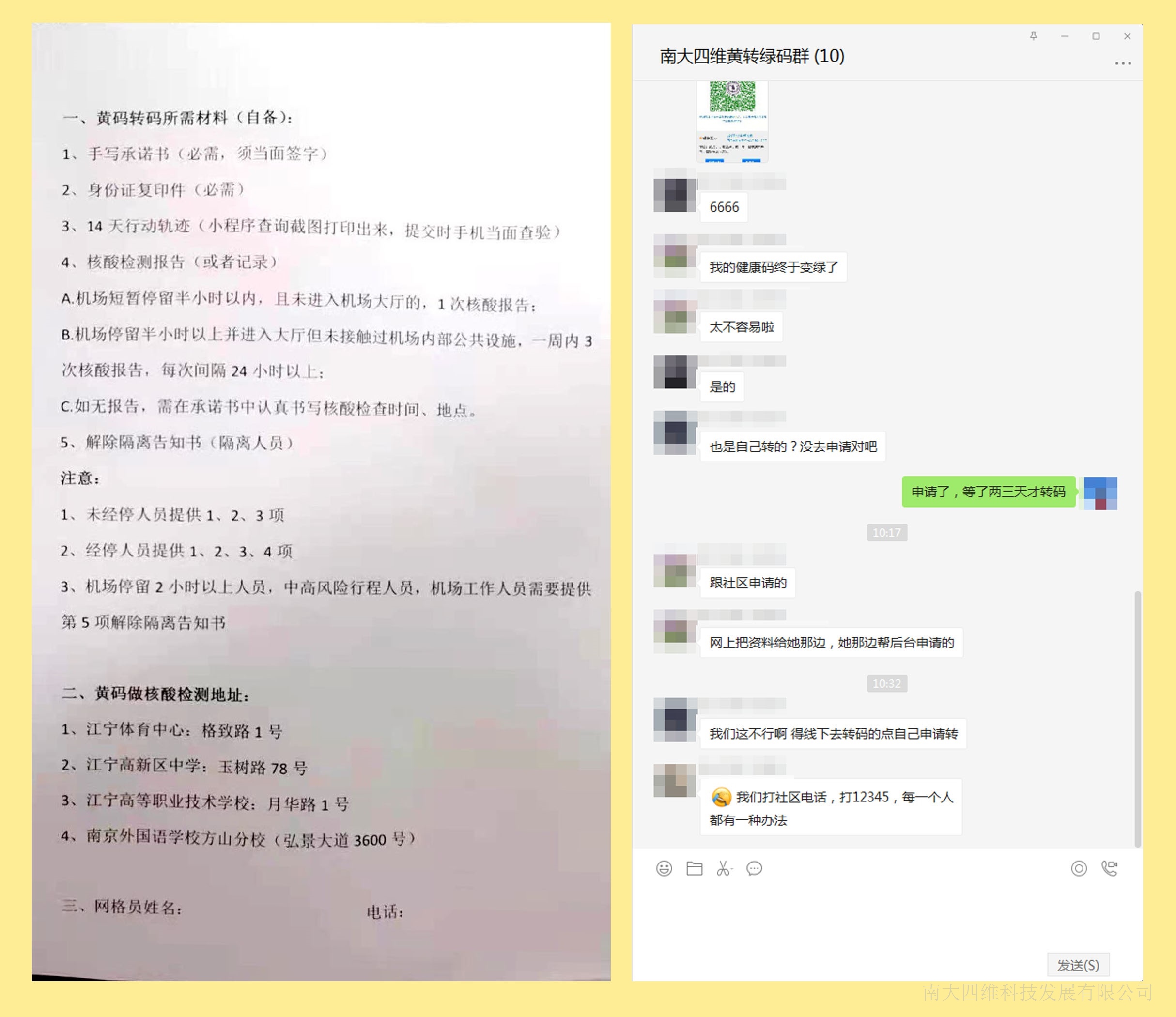 在接收到公司员工健康码出现黄码的情况下,行管中心立刻要求员工居家隔离,联系江宁区防疫指挥部或下属机构,向黄码的员工提供黄码转码的所需的材料单及黄码核酸检测点地址,每日跟进黄码同事的健康码转码的核酸检测情况、转码申请进度直到员工健康码转为绿色。