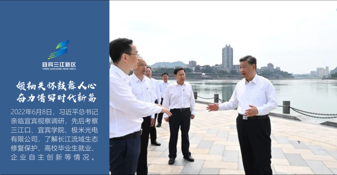 2022年6月8日中共中央总书记习近平亲自视察宜宾三江口、宜宾学院、极米光电,总书记对三江新区建设成为华西南数字化、智慧化高技术新区表达了殷切希望。孟局长讲解的同时希望南京大学作为国内顶级高校,能够把更多数字城市规划、智慧园区新的研究技术通过旗下南大四维公司孵化、转移到三江新区建设中来。
