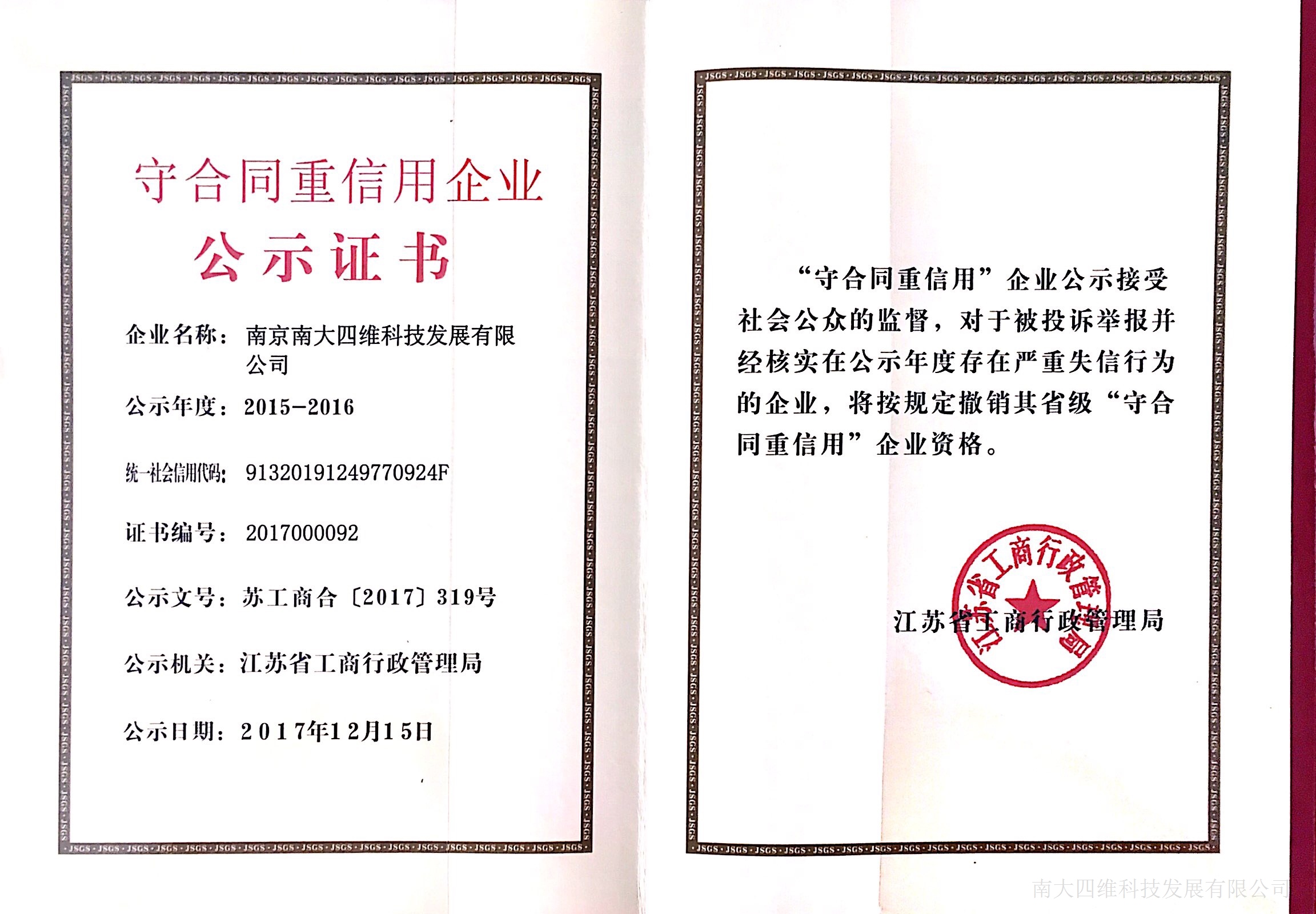 祝贺我司荣获江苏省工商局2015-2016年度省级“守合同重信用”企业